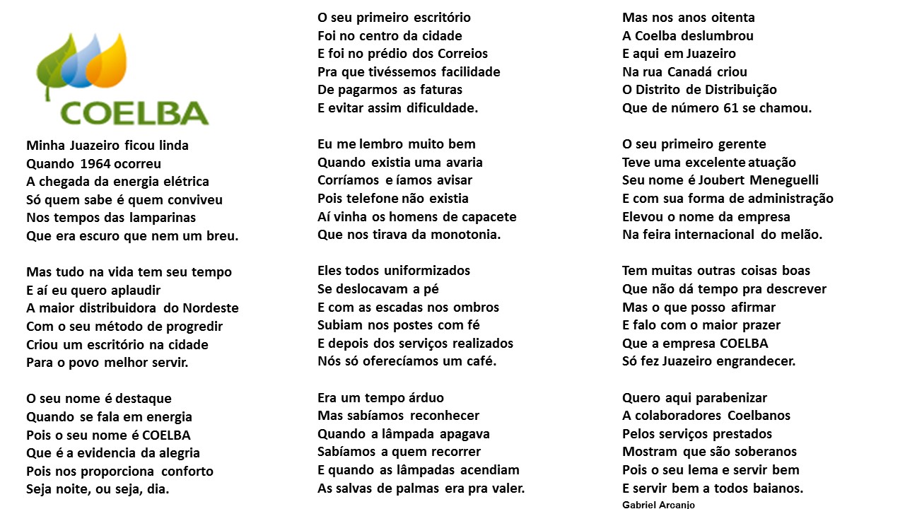 O diretor do Sinergia Gabriel Arcanjo, carinhosamente conhecido entre nós como “Comando Virgulino“, fez uma bela homenagem à cidade de Juazeiro, contando paralelamente a história da Coelba e sua importância para a população. Gabriel, além de militante combativo e respeitado, tem um talento nato para escrever cordel.
