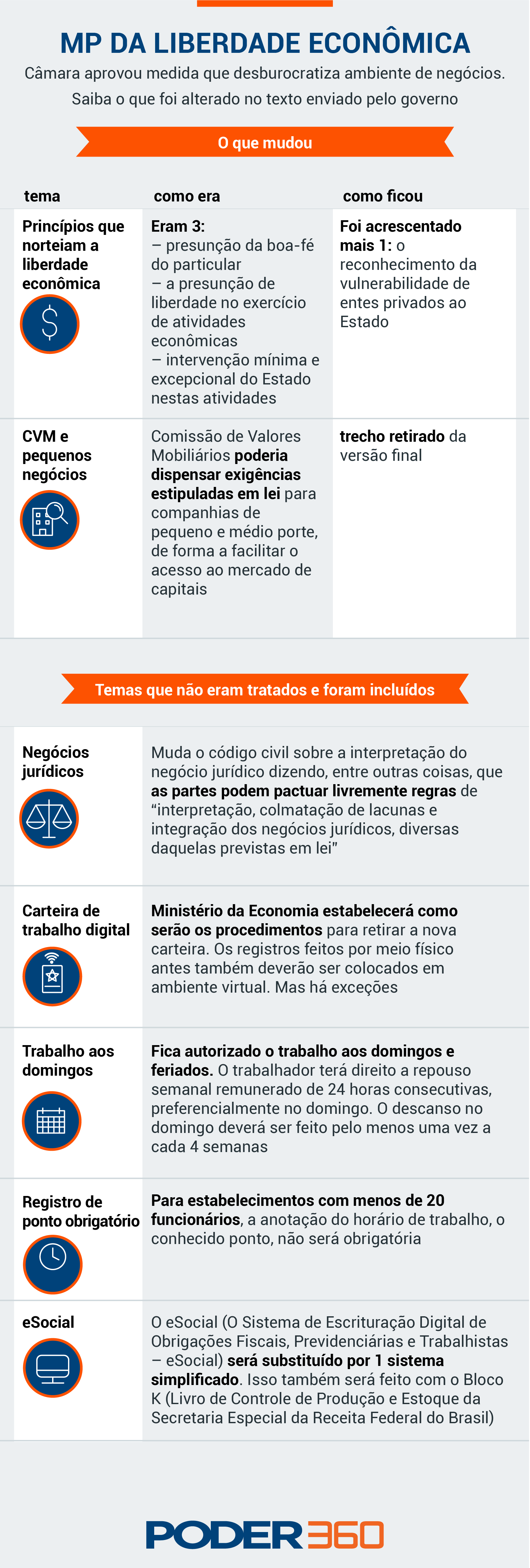 A Câmara dos Deputados aprovou nesta 3ª feira (13.ago.2019), por 345 a 76, o texto-base da MP (Medida Provisória) da Liberdade Econômica (881/19), que desburocratiza trâmites para empresas e cria garantias de livre mercado. Ainda faltam ser analisados os destaques à matéria, que em seguida vai para a análise do Senado Federa. As regras perdem validade se não tiverem parecer final até 27 de agosto.