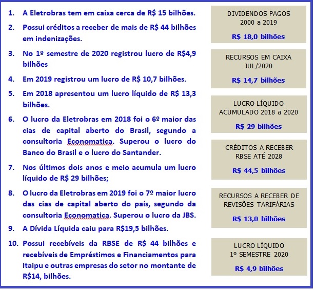 Em resumo, a Eletrobras lucrou R$ 29 bilhões nos últimos dois anos e meio, sendo R$ 4,9 bilhões no primeiro semestre de 2020, possui R$ 44,5 bilhões para receber até 2028 e R$ 15 bilhões em caixa.