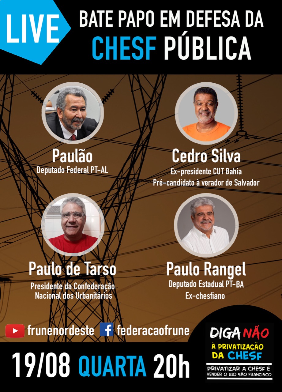 A Fune está realizando uma série de Lives para ajudar na luta contra a privatização da Eletrobras/Chesf. Nesta semana, o “Bate papo em defesa da Chesf pública” vai ter a participação do presidente da CNU e diretor do Sinergia, Paulo de Tarso, Cedro Silva, ex presidente da CUT Ba e os deputados Paulo Rangel, da Bahia, e Paulão, de Alagoas.