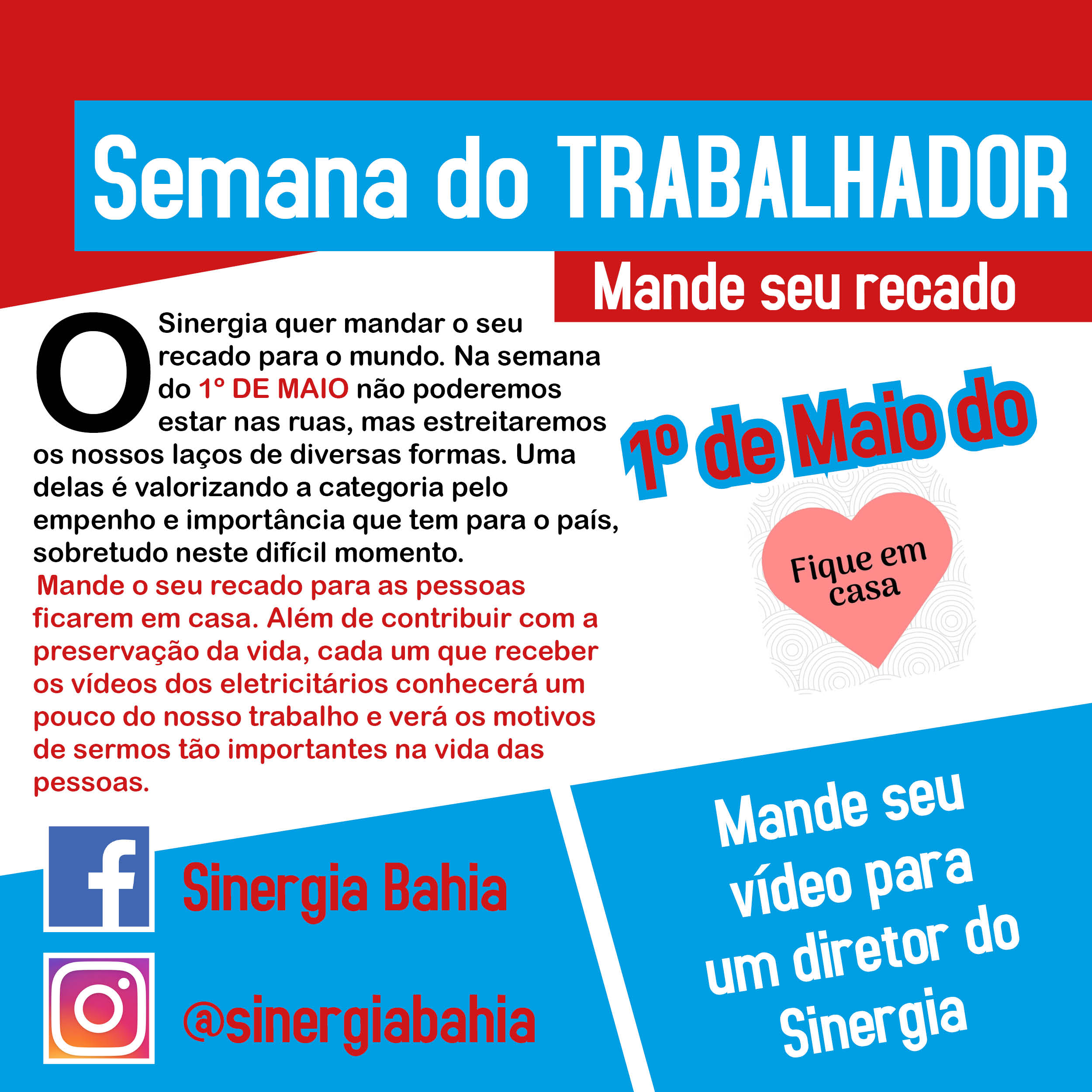 O Sinergia quer mandar o seu recado para o mundo. Na semana do 1º de maio não poderemos estar nas ruas, mas estreitaremos os nossos laços de diversas formas. Uma delas é valorizando a categoria pelo empenho e importância que tem para o país, sobretudo neste difícil momento. Mande o seu recado para as pessoas ficarem em casa. Além de contribuir com a preservação da vida, cada um que receber os vídeos dos eletricitários conhecerá um pouco do nosso trabalho e verá os motivos de sermos tão importantes na vida das pessoas.
