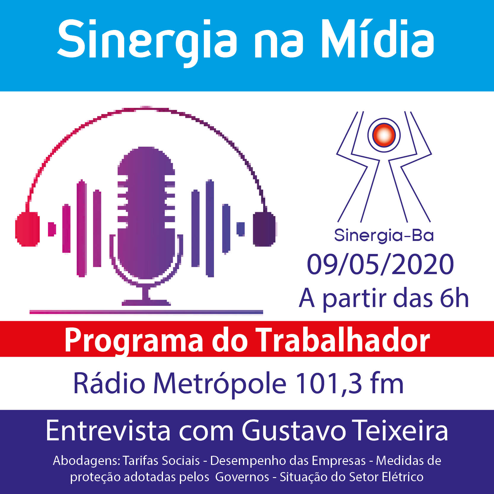 Neste sábado, 09/05/2020, o técnico do Instituto Ilumina, Dieese e assessor do CNE, Gustavo Teixeira, vai ser entrevistado no Programa do Trabalhador, na Rádio Metrópole, 101,3 FM. Gustavo irá representar o Sinergia CNU e Frune nas discussões sobre Tarifas Sociais – Desempenho das Empresas – Medidas de proteção adotadas pelos Governos e a Situação do Setor Elétrico.