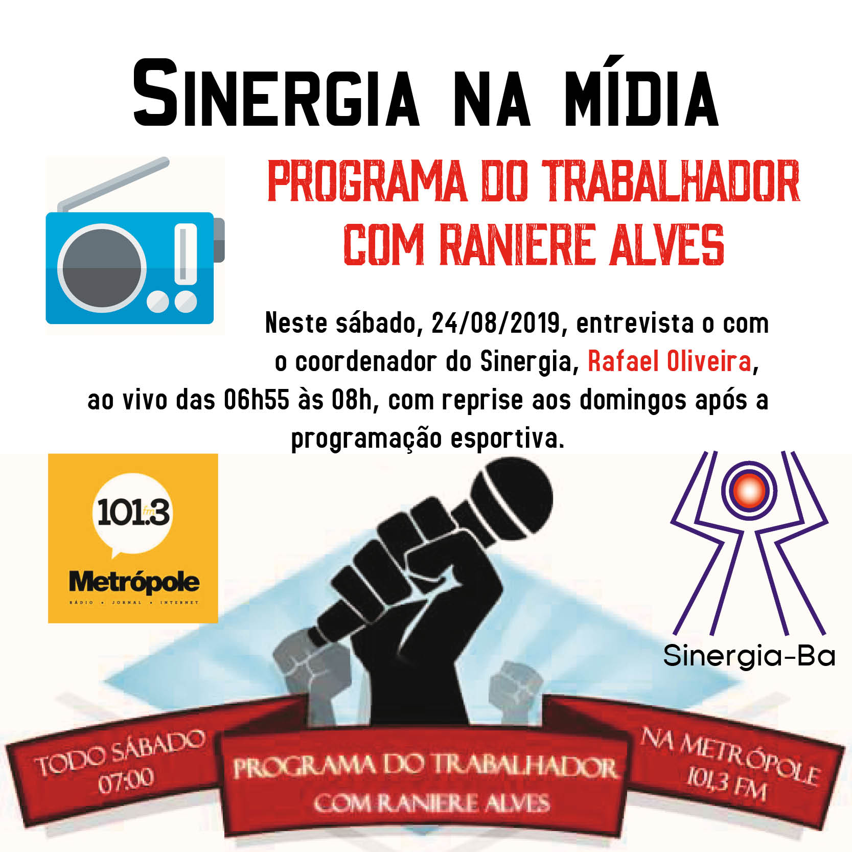 Neste sábado, 24/08/2019, entrevista o com o coordenador do Sinergia, Rafael Oliveira, ao vivo das 06h55 às 08h, com reprise aos domingos após a programação esportiva.